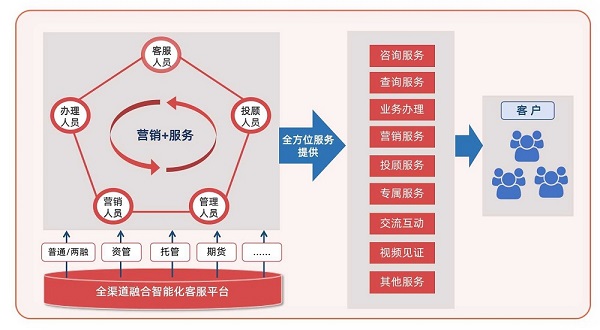 (4)全員統一服務:除了客服中心坐席人員,支持包括后臺人員、客戶經理、投資顧問等其他人員,統一通過客服中心平臺為客戶提供全方位的服務,并根據監管部門的要求,對整個服務過程進行錄音、留痕等監管措施。公司分支機構后臺人員、客戶經理、投資顧問等員工可以通過操作CRM系統、APP、投顧系統等平臺調用呼叫中心相關模塊的方式,進行客戶服務,實現整合公司全體資源,對內協同辦公、靈活調度、全員參與,對外統一服務、提升公司品牌形象。